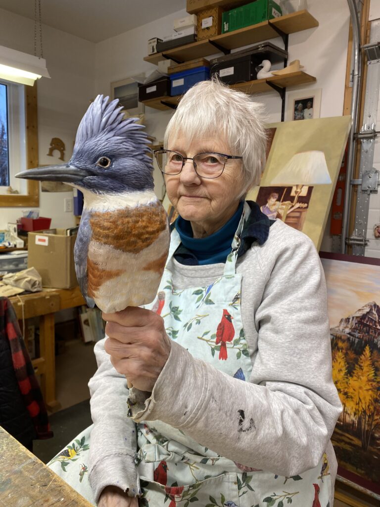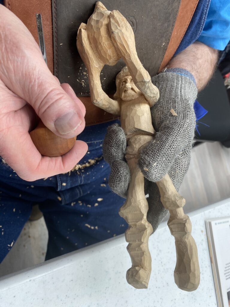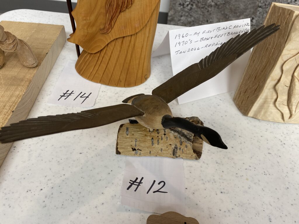 This was my 1st carving in early 1960 after a 5 year break in carving. Made from a spruce 2 x 4 and roughed out with a hatchet. My knife was war surplus and it is painted with oils. The original base was a burl and the pedestal was perspex from a Spitfire windshield, it got busted in the 70’s and the feet were lost. It rattled around in a box until I restored it in Jan 2026.