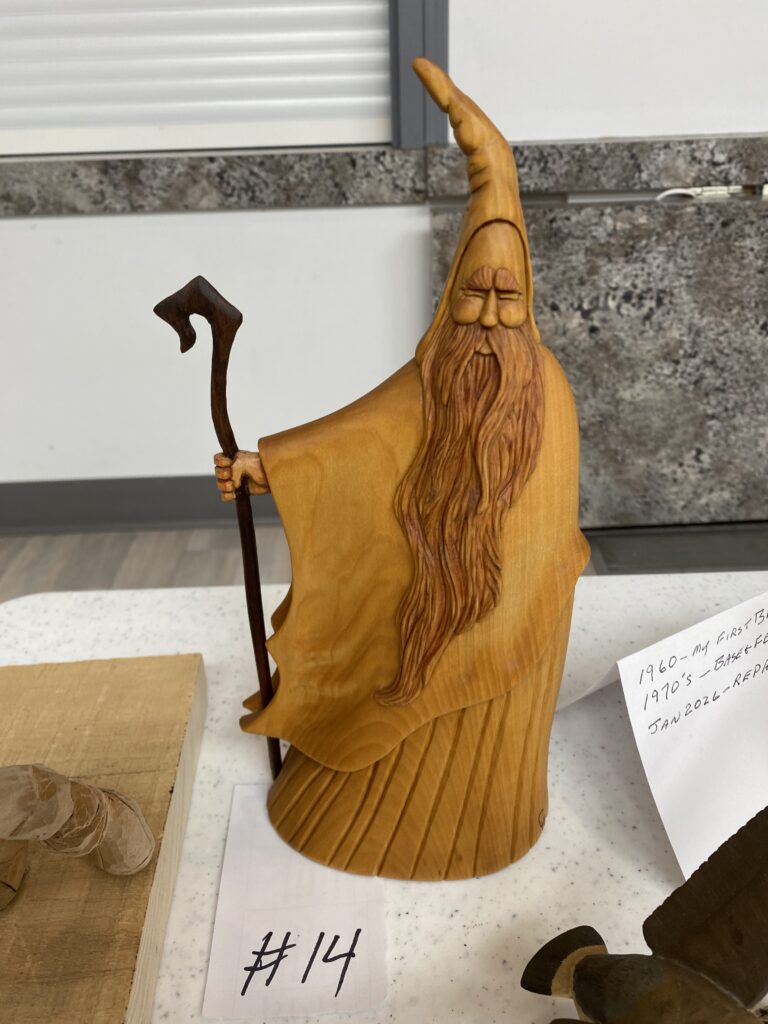 The Wizard, carved by Howie C. was inspired by Middle Earth’s Gandalf character. Completed in March of 2020, it was roughed out from a large block of basswood, 12″ x 6″ x 4″ with a staff carved from black walnut. The working drawings, photos and instructions by Shawn Cipa in his book Carving Fantasy & Legend Figures in Wood were understandable and easy to follow, leaving no doubt in the mind of even a novice carver as to what was required to achieve a successful completion. This wizard was given a hand-rubbed finish with both Danish and Tung oil to enhance the colour and contrast of whatever grain patterns that emerged through the shaping process. A number and variety of troughs were carved into the wizard’s coat to give the impression of movement caused by a strong wind. The beard was carved with wind in mind as well, thus emphasizing its flowing patterns and a finish with a light mahogany stain to enhance contrast.well.