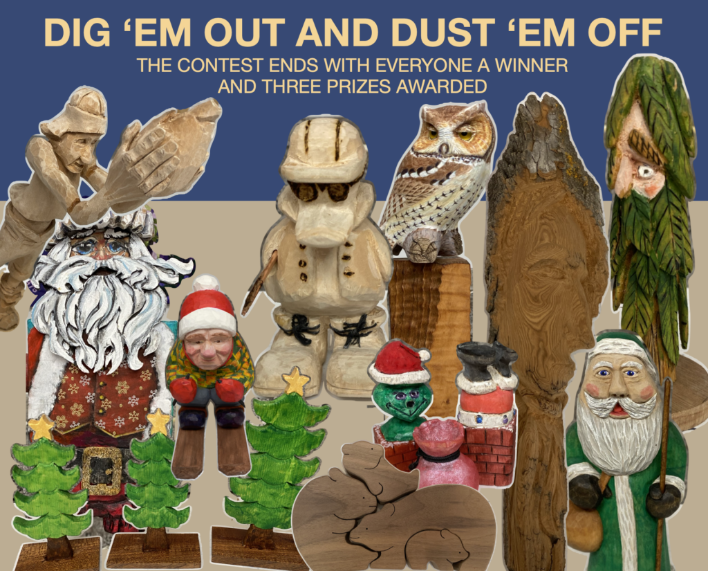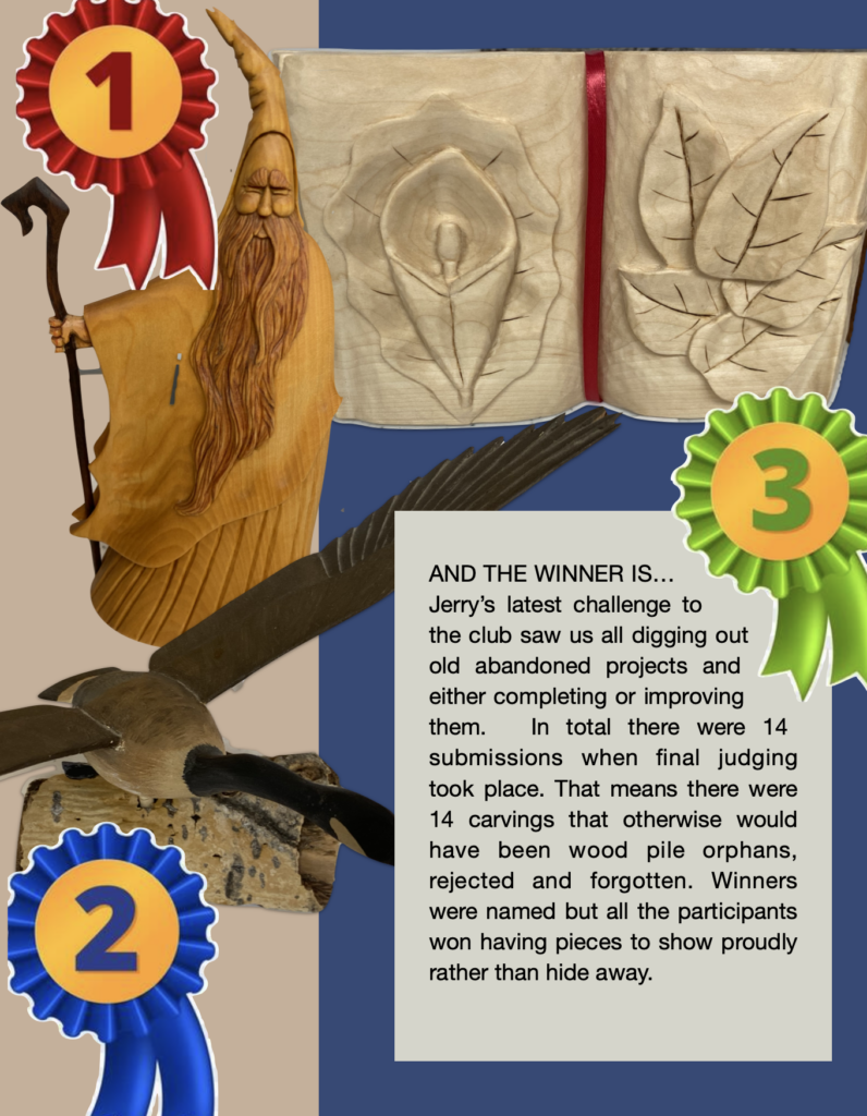 AND THE WINNER IS… Jerry’s latest challenge to the club saw us all digging out old abandoned projects and either completing or improving them. In total there were 14 submissions when final judging took place. That means there were 14 carvings that otherwise would have been wood pile orphans, rejected and forgotten. Winners were named but all the participants won having pieces to show proudly rather than hide away.