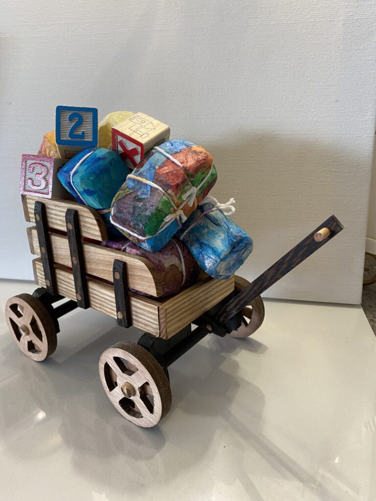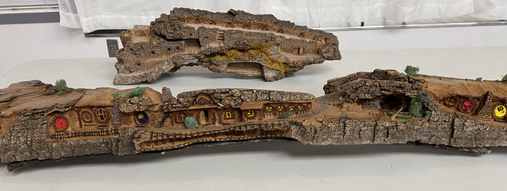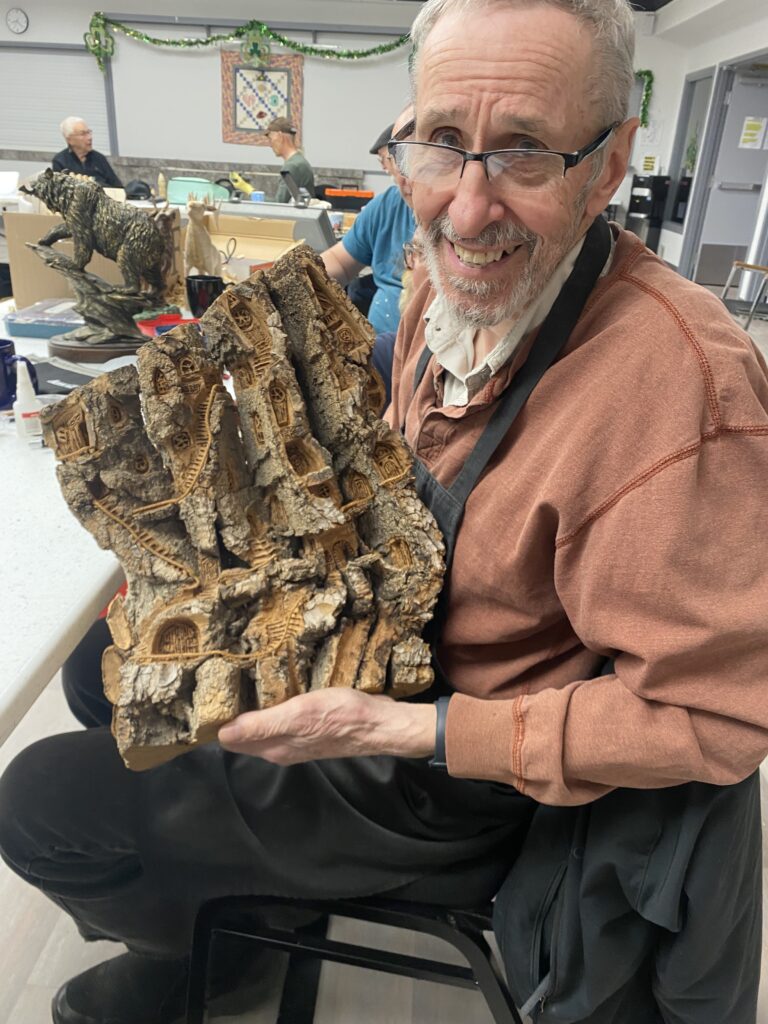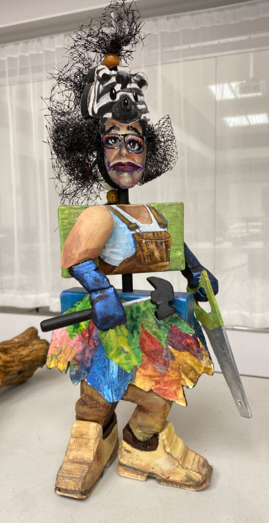 Fallen tree roots as a hand and a bear, pallet wood spoon and bunny, crazy character assembled from a combination of 2 x4’s, 2 x 6’s, baseboards, masonite and scrap bass, bark carving characters and an intricate village (below).