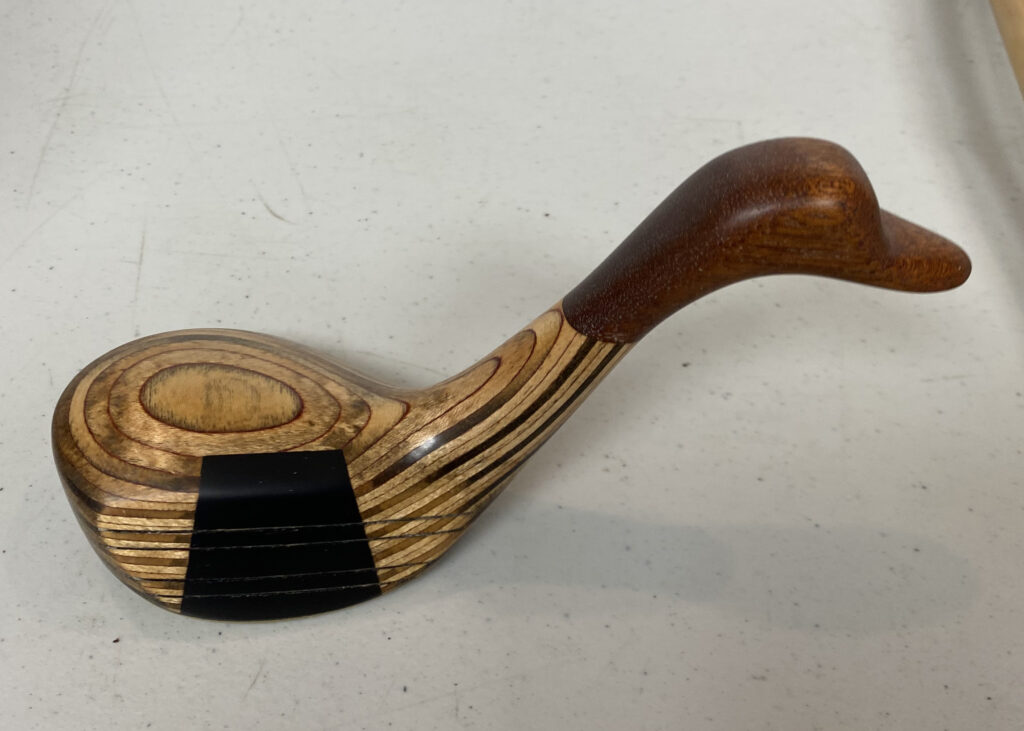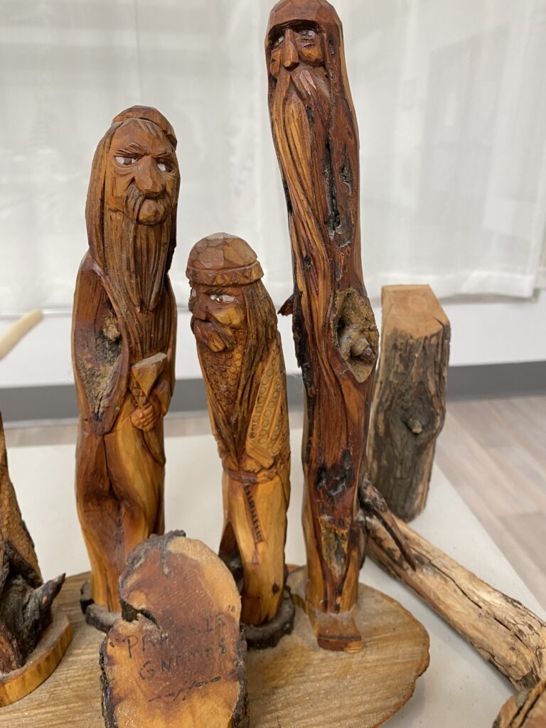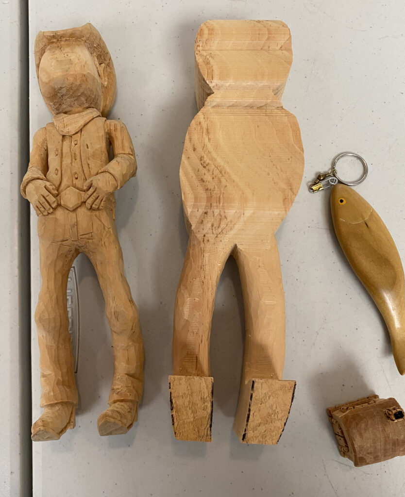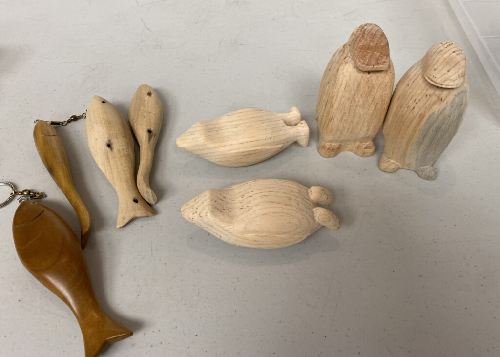 An aspen mallet, small branch carved ornamentally, caragana mice, pallet wood key chains, diamond willow wisemen, broken golf club duck (above).
