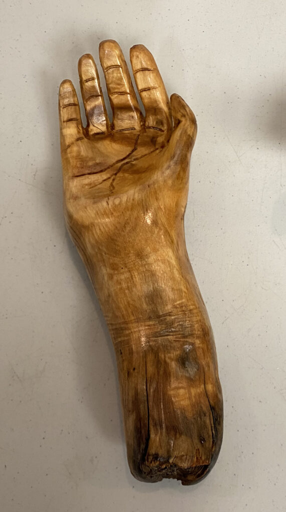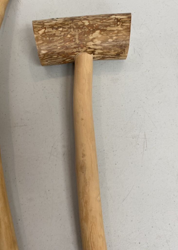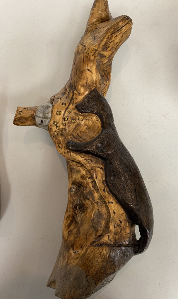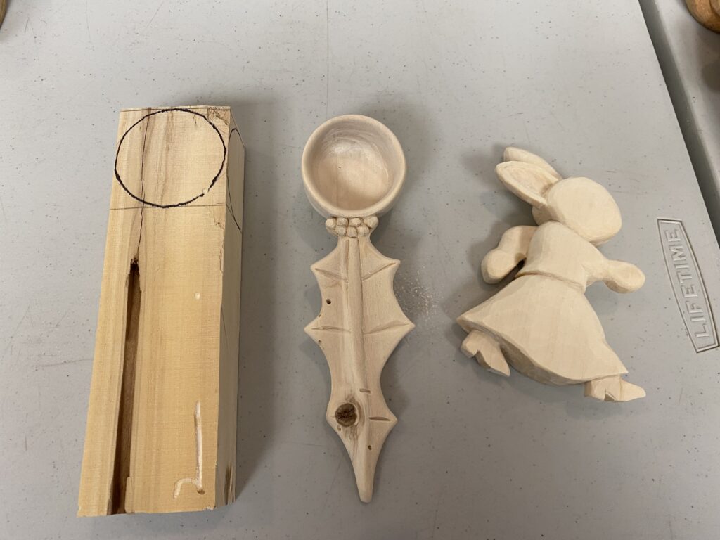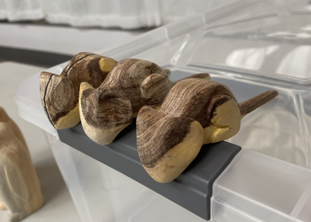 An aspen mallet, small branch carved ornamentally, caragana mice, pallet wood key chains, diamond willow wisemen, broken golf club duck (above).