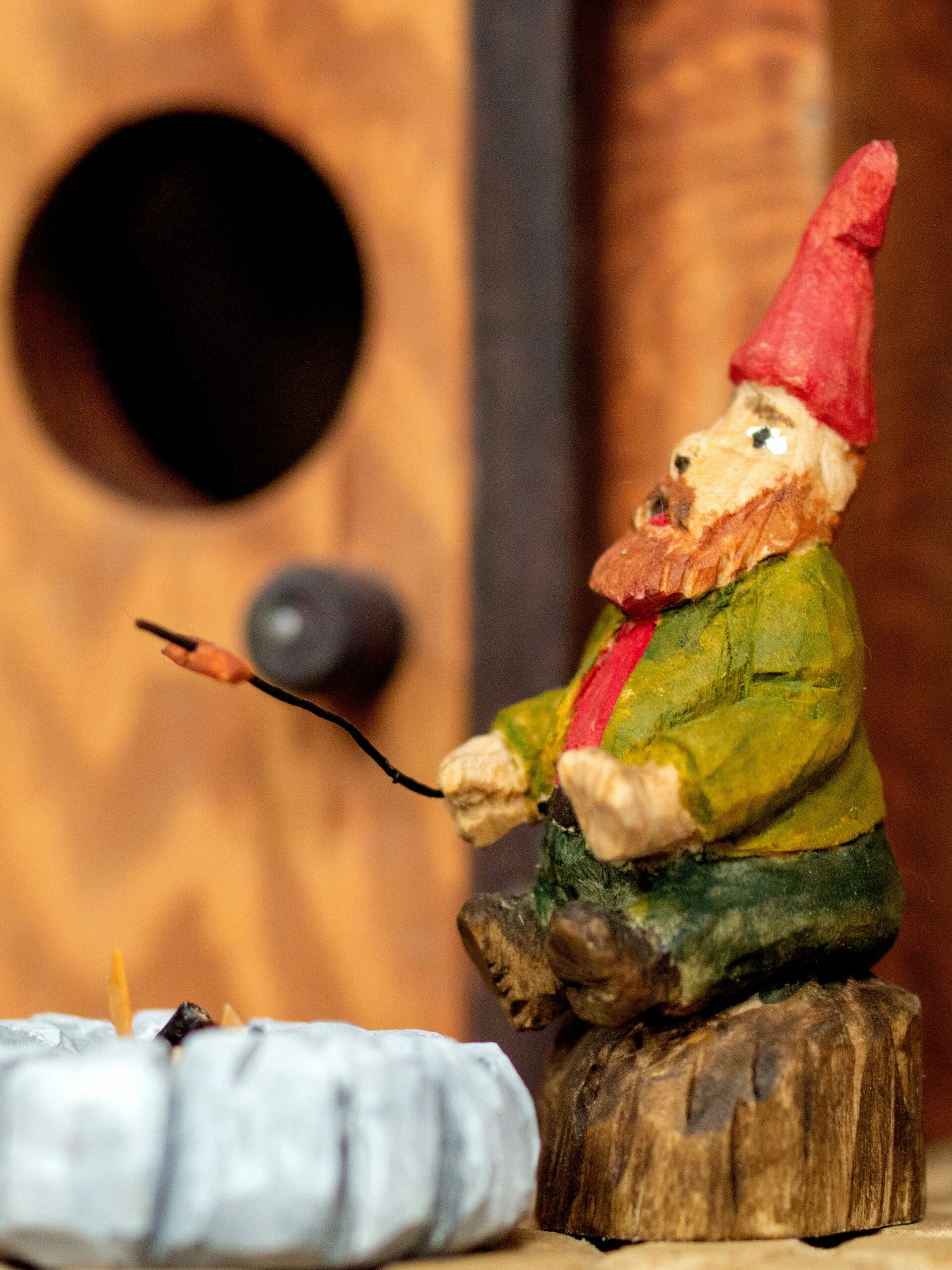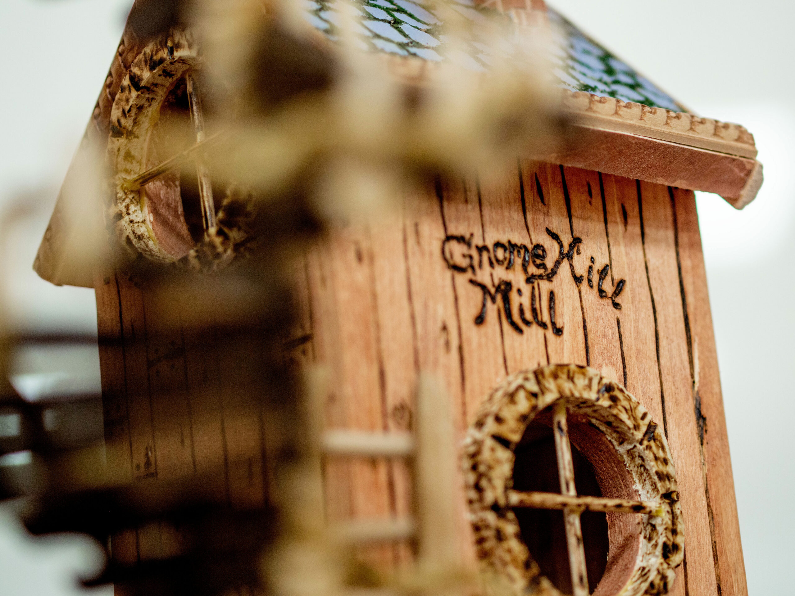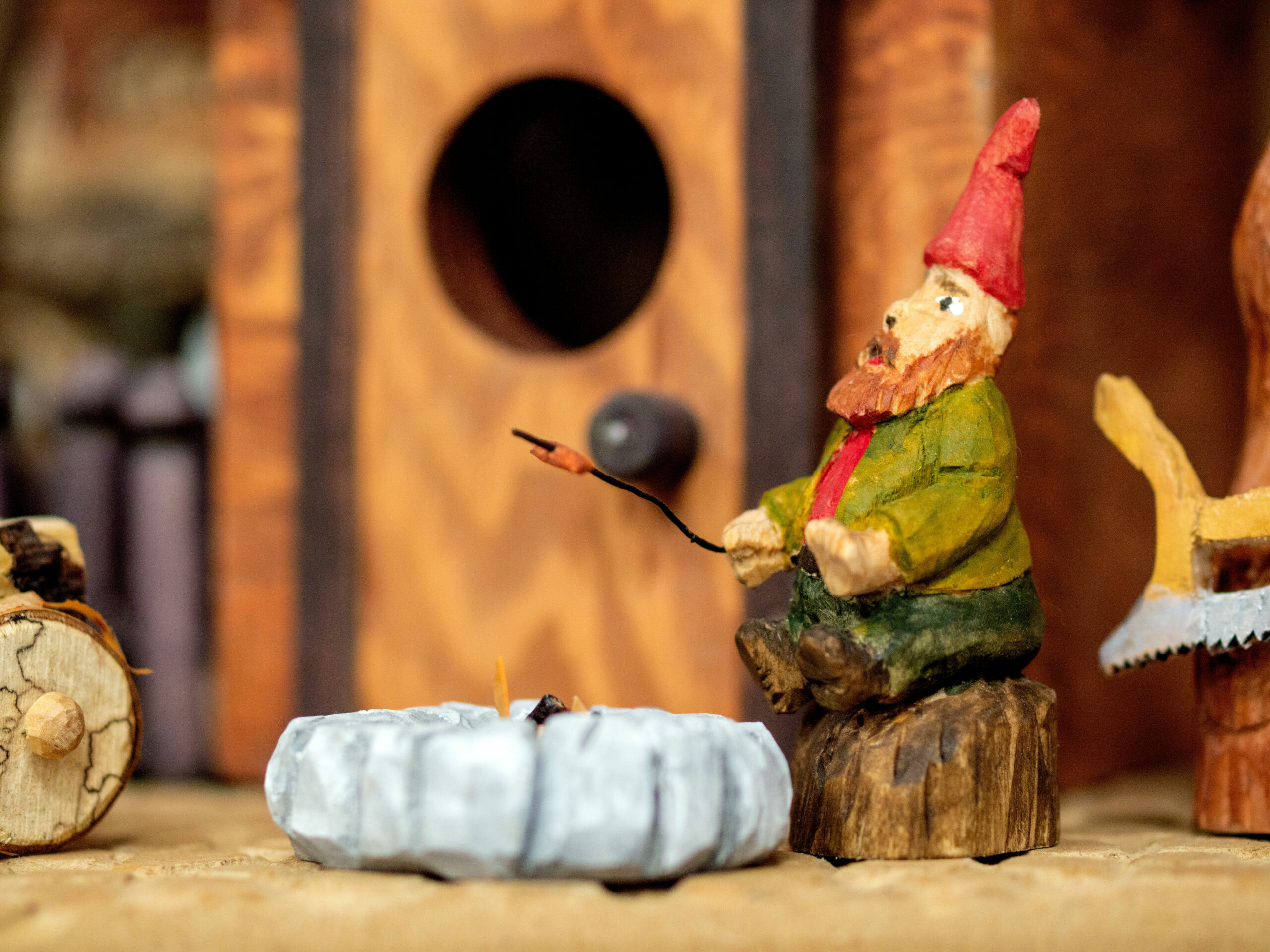 Growing out of an in house challenge by one member to the rest of the club, to match his carving of a gnome, we have created an entire village. The concept of this village is a community of gnomes overtaking and occupying a birdhouse condominium project and making it their own.